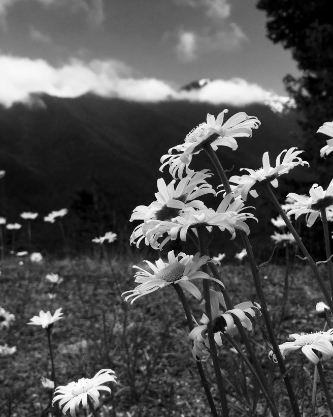 Daisies: dozens upon dozens of them, nodding their cheery heads in unison on the other side of a low rock wall. Suddenly, they became the subject, the mountains the backdrop.